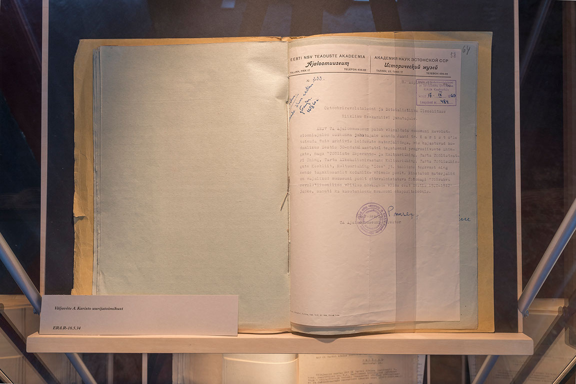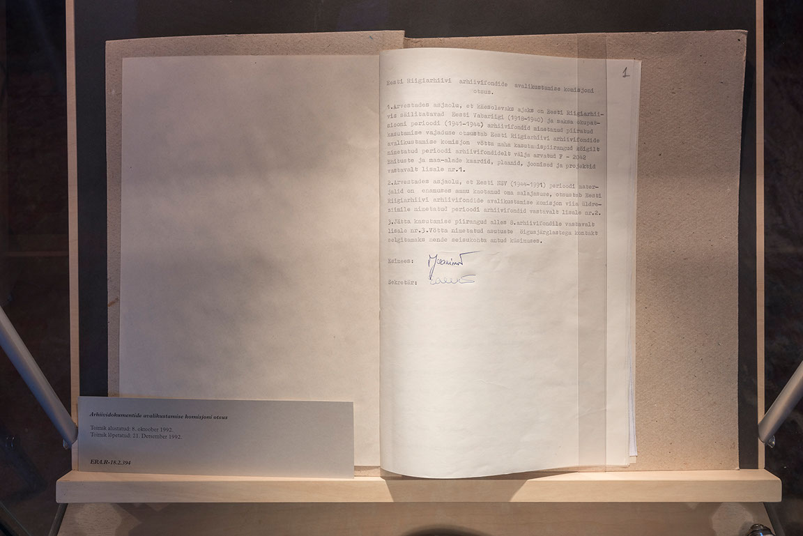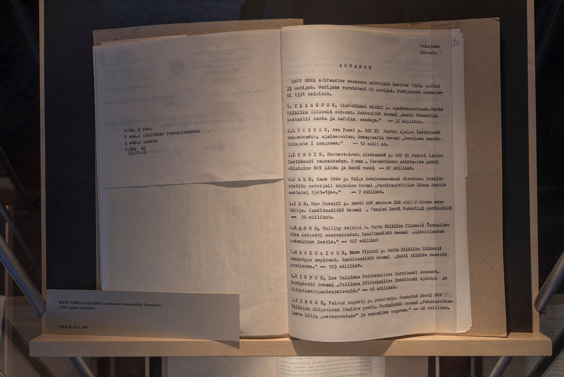 The exhibition was accompanied by a publication featuring essays by me, historian Peep Pillak, and art historian and curator Annika Toots that opened the context of the project and the history of the restricted collections. The exhibition included a dedicated reading area where a collection of articles offered an overview of the period in the late 1980s when the restricted collections were opened to the public and the awakening movement of the archives in Estonia took place.