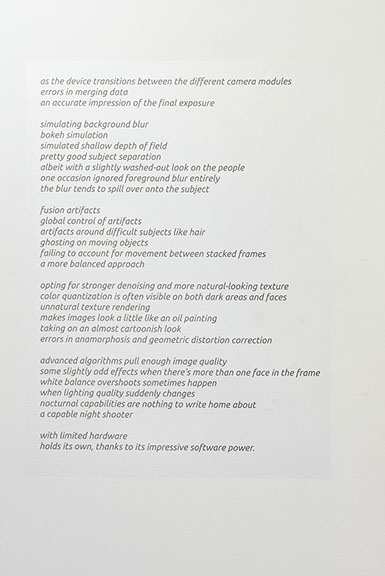Dictated by the market, smartphone photography evolves at a fast pace. With every new generation of phones, the abilities of the software increasingly outweigh the capabilities of the hardware. The artificial intelligence which powers the software through computational photography is trained to simulate the effects usually achieved by the complex lens systems on professional grade cameras. New smartphones, like other electric consumer devices are being reviewed by youtubers and imaging analysts. This work looks at the culture of smartphone reviews, focusing on the website dxomark.com. Dxomark tests every new popular smartphone and gives it a rating. To evaluate the capabilities of these smartphones they use two methodologies: scientific analysis and “real world” tests. The scientific approach uses the tools that are used to analyse professional imaging equipment like color targets, resolution wedges and geometric distortion measurements. The real world tests are used to analyse the believability of the camera's abilities. For example, the camera’s abilities to simulate background blur are tested in different environments and the examples made are shown on the review page. The examples of these tests are exhibited on this page as enlarged image crops and the language used in reviews to describe the software effects is more connected to digital animation than traditional photography. These provocations which sometimes show the limitations of the device are interesting to me because most smartphone photography exists in the web 2.0 platforms like Instagram which is influenced by different photographic trends. The images shown on instagram are not usually enlarged so the camera failures are not evident. It seems that this photography operates on a suspension of disbelief and reveals that the technical qualities of the image are not the most important aspects. These images are social (Jurgenson) and as the computational photography evolves, the parallels to traditional photography start to fade. Soon the smartphone cameras effortlessly simulate the effects of professional cameras and start producing new kinds of hyper real images.